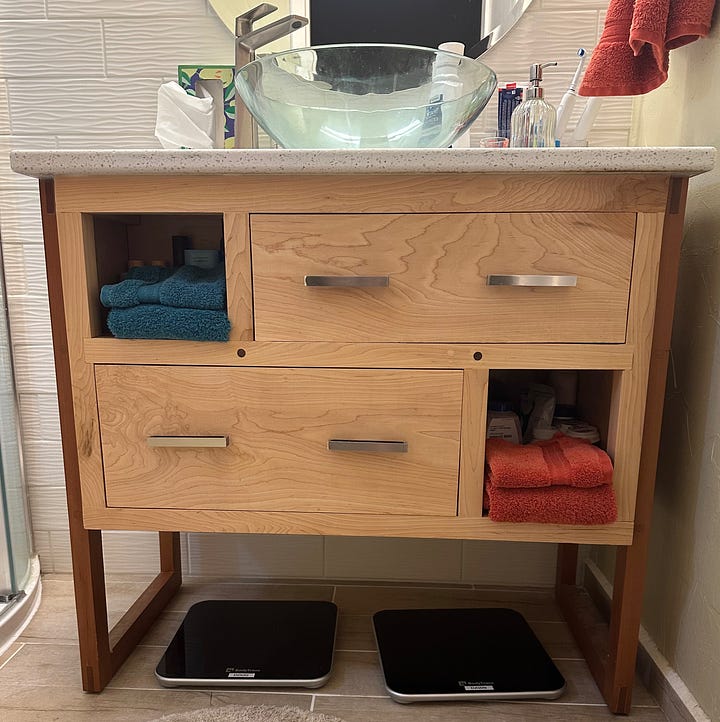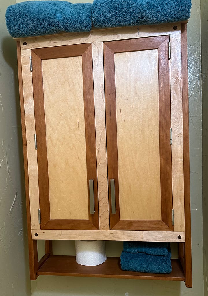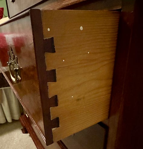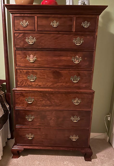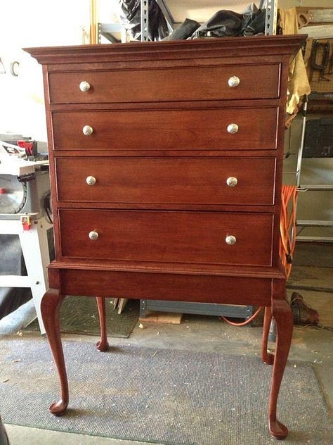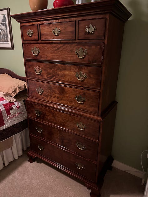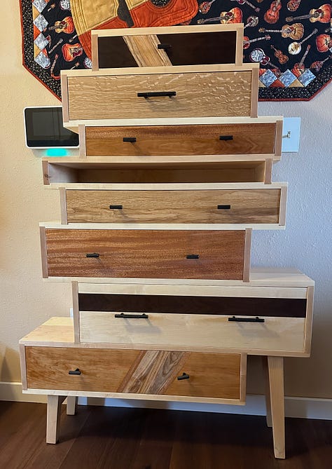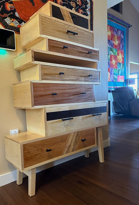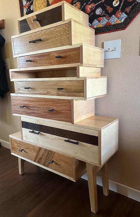 I end with my latest project just finished a few weeks ago. Dawn and I designed this chest of drawers and I began the project in the spring of 2023. The carcass is made of hard rock maple and is incredibly heavy - so heavy I made it to come apart in two pieces. The major challenge for the carcass was figuring out a way for the tapered, slanted legs to be capable of holding all of the weight. The drawer fronts are made from combinations of maple, ash, quarter-sawn oak, cherry, walnut and African mahogany.