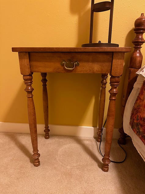 This bed and side table were actually made from the maple that I used to build that infamous canopy bed that was stuck in my parent’s basement. In the middle picture I lifted the bedding to show the rope that provides the suspension for the mattress. One rope runs interwoven in both directions. Again, this is a reproduction. I eventually had to put a piece of plywood on top of the rope suspension so the mattress wouldn’t sag as much. The big challenge on these pieces of furniture was to duplicate accurately the turnings on the beside table and bed.